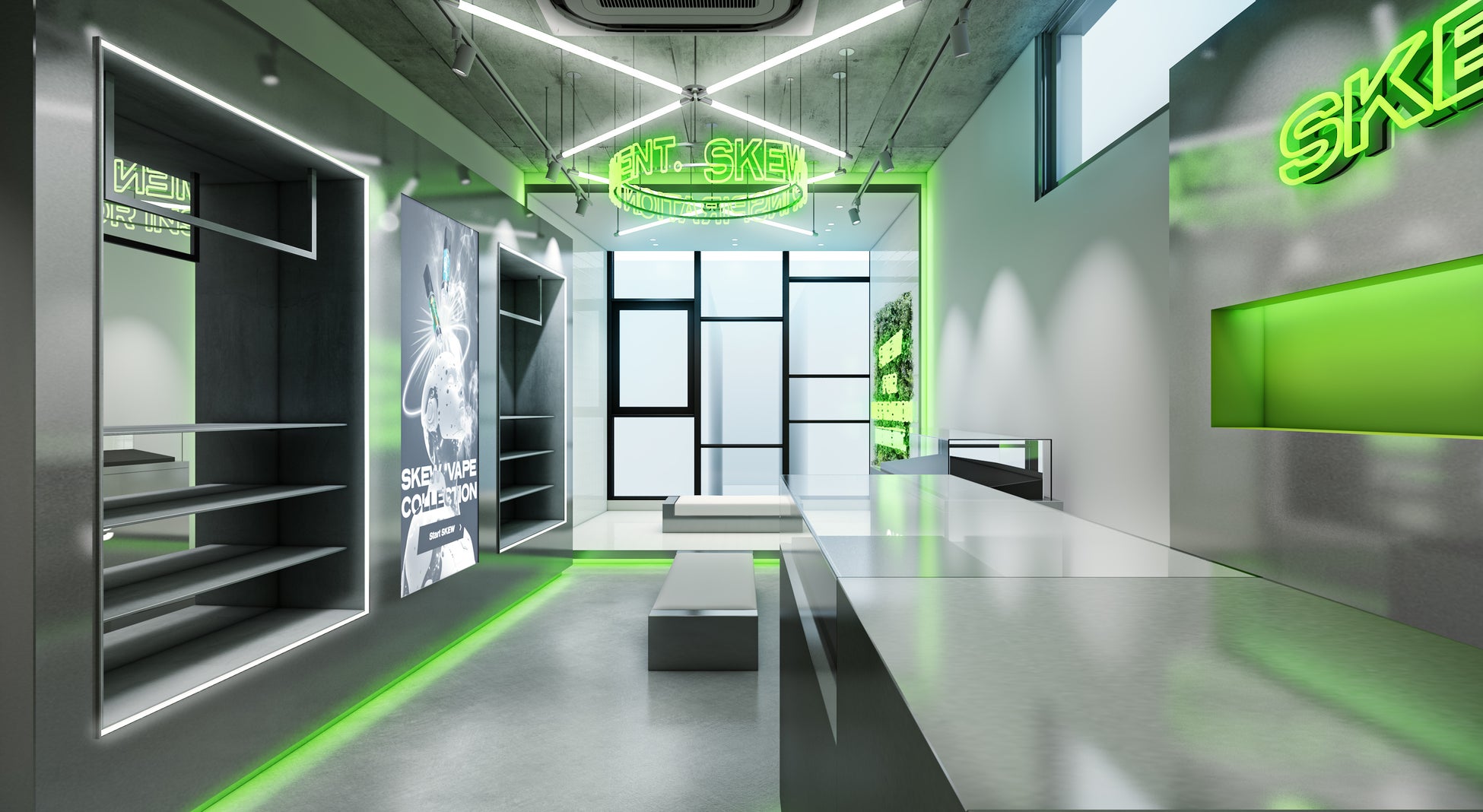 『skew Shibuya』では、オンラインストアで人気の製品に加え、ブランド関連グッズやアパレルアイテムなどを豊富に取り揃えています。また、すべてのCBDベイプ製品を実際にお試しいただける体験型の店舗として、「skew」の世界観を直接感じていただける空間を目指しました。